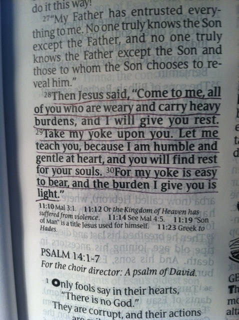 We’re supposed to give all of our burdens to him – our worries, our endless to-do lists, our fears. And then he gives back to us the things he wants us to do – our purpose for being here on earth.