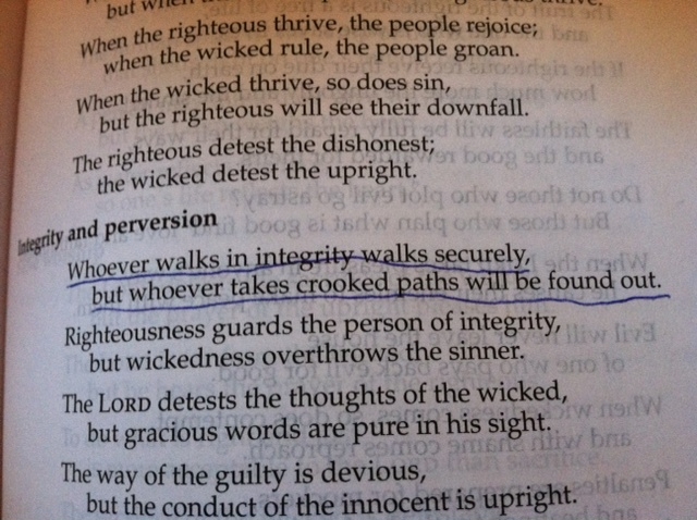 ‘Whoever walks in integrity walks securely but whoever takes the crooked paths will be found out.’ – Proverbs 10:9