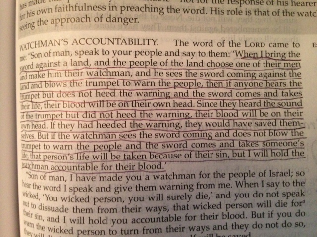God tells us in Ezekiel that we are the watchmen. And when the watchmen see danger and destruction coming, they need to blow their trumpet to warn the people. That’s their job.