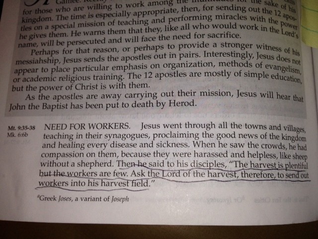 He tells his disciples that the harvest is plentiful but the workers are few.