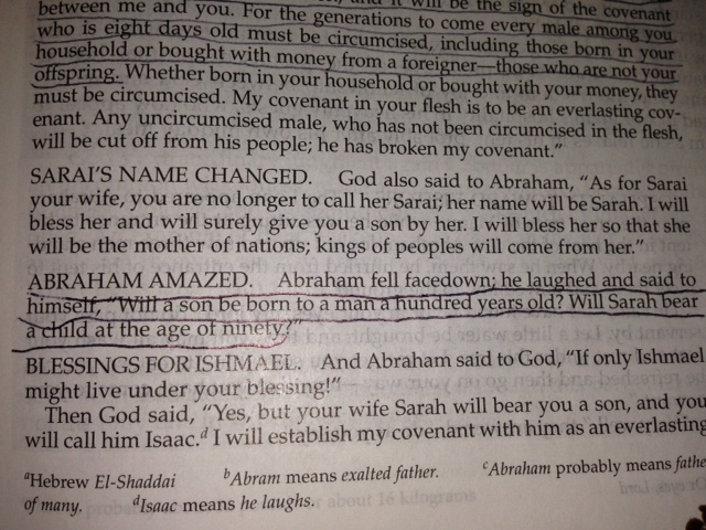 When God tells Abraham that Sarah hs going to have a son, Abraham laughs. He asks how a son is going to be born of a man who is a hundred years old and his wife who is ninety?