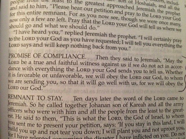 The remnant of Judah pled with Jeremiah to ask the Lord for direction.  They said, “May the Lord be a true and faithful witness against us if we don’t act in accordance with everything the Lord your God sends you to tells us.” August 31 2014 They said no 1