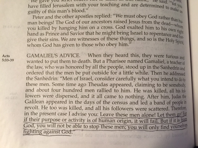 In Acts 5, Gamaliel advised the Sanhedrin, “Leave these men alone! Let them go! For if their purpose or activity is of human origin, it will fail. If it is from God, you will not be able to stop these men; you will only find yourselves fighting against God.”