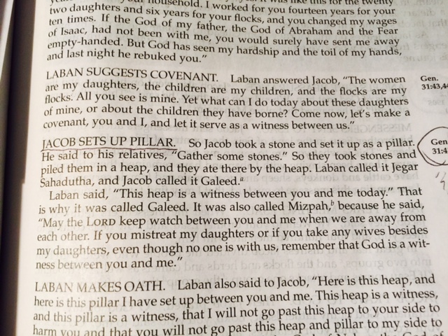 We read in Genesis that Laban and Jacob made a covenant and Jacob set up a pillar to remind each of them of their promises to one another.  From this day forward, we will not harm one another.