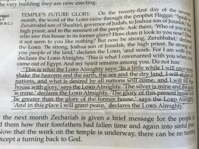 The Lord Almighty told the Israelites that in a little while he was going to “shake the heavens and the earth, the sea and the dry lands.  I will shake all the nations and what is desired by all nations will come, and I will fill this house with glory.” (vs 2:6,7)