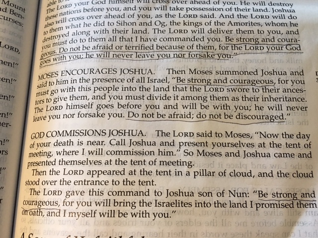 God told Joshua to be strong and courageous. ‘Do not be afraid’. Moses said this to Joshua twice and God said it again in the first several verses of Deuteronomy 31.