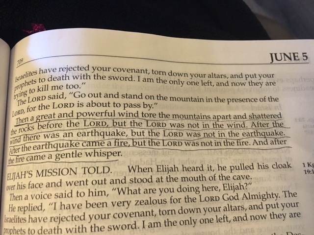 And this is what God revealed to Elijah in 1 Kings 19.  God told Elijah that he would not find him in the powerful wind or in the earthquake or the fire.  After the fire would come a gentle whisper – straight from God.June 5 2016 in the whisper