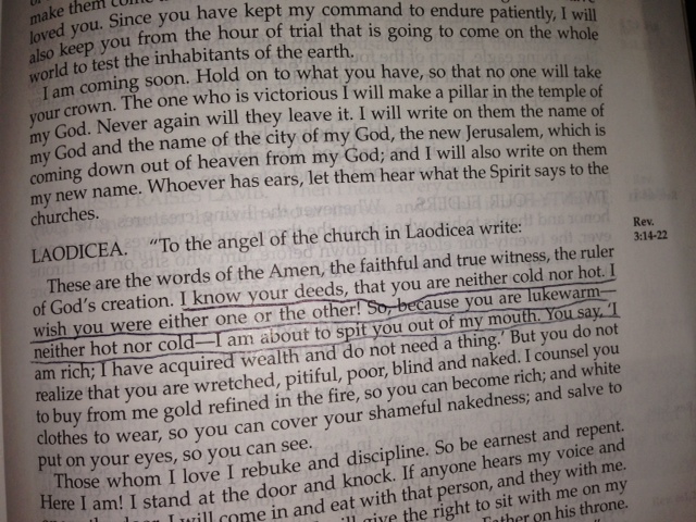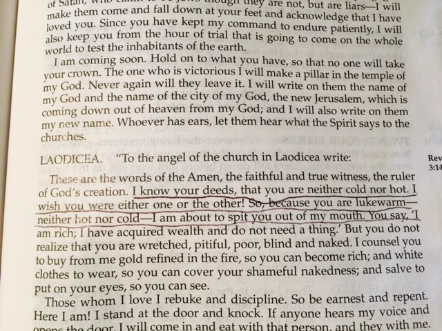 I am almost finished reading the entire Bible for the 14th time and, as I begin to read God’s final Revelation to us, the Spirit is writing to the 7 churches through John. Of these messages, the one that reverberates through my heart and mind are his words to the church of Laodicea –