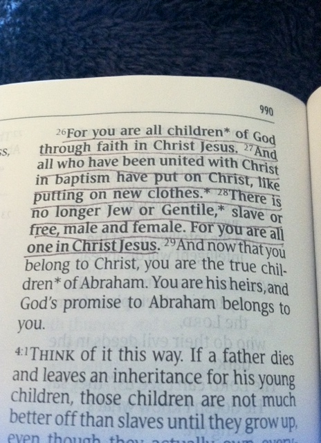 Paul tells us in Galatians 3 that we are the children of God through faith in Jesus Christ.  We have become new people who have put on new clothes.  There is no longer Jew or Gentile, slave or free, male or female.  We are all one in Christ.