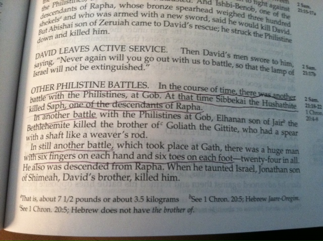 I thought it was really interesting to hear about the Israelites battling a huge Philistine in Gath who had six fingers on each hand and six toes on each foot.
